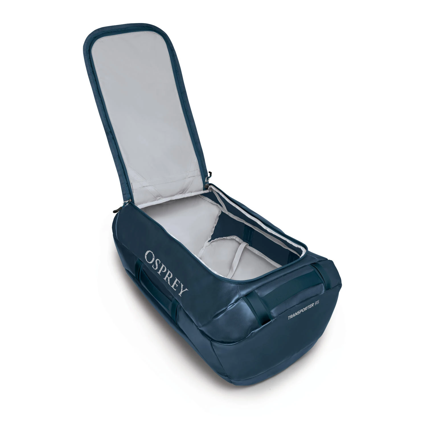 A yoked harness with sternum strap ensures that the load is carried comfortably. When not in use, the harness can be stowed inside a cleverly designed sleeve. Transporter 95 also features a detachable padded shoulder strap to provide another way to carry, perhaps when you’re already carrying another Osprey pack. Dual end pockets, a pocket under the lid and internal compression straps help to keep the contents organised, whilst an ID card holder ensures you’ll know which duffel is yours immediately. A large U-shaped opening gives easy access to your contents.